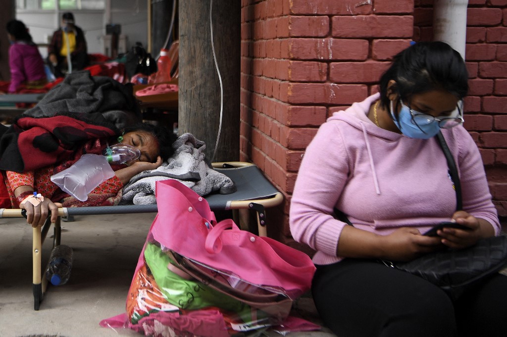 A Covid-19 coronavirus patient wearing oxygen mask breathes using the medical oxygen outside a hospital in Nepal. Photo: Prakash Mathema/AFP.